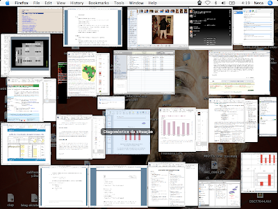 Este é o aspecto do meu ambiente de trabalho após ter o portatil três dias ligado para fazer um trabalho para plano de marketing. Em disposição estão os documentos que usei como bibliografia. Isto sim, é multi-tasking.